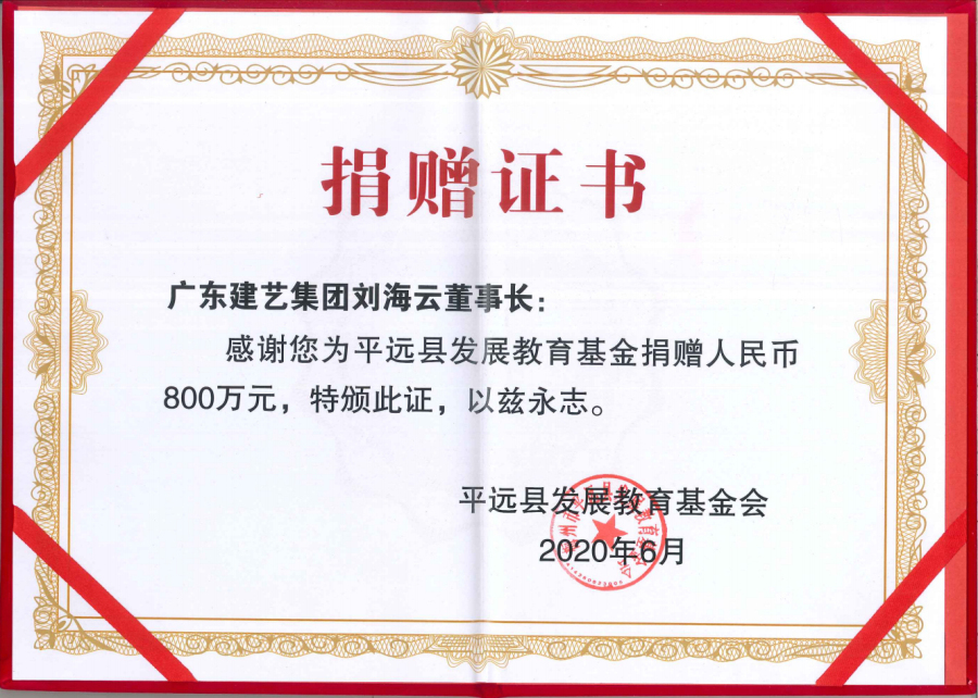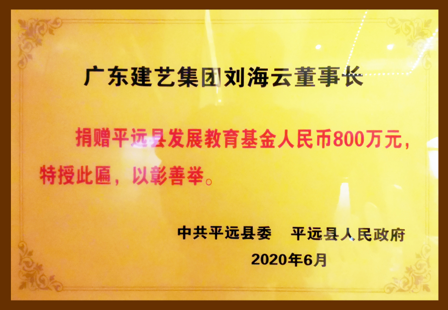 廣博大愛·助力粵東從1994年成立至今,作為廣東企業(yè)500強的建藝集團,始終把“以德為先,誠信為本,構(gòu)筑精品為目標”的企業(yè)宗旨體現(xiàn)在促進國家、民族與社會的繁榮進步之中。董事會主席劉海云更是以身作則,堅持用大愛回饋社會,累計捐資數(shù)千萬元,為大批貧困地區(qū)提供支持,極大促進了當(dāng)?shù)亟逃⑨t(yī)療、民生等事業(yè)的進步發(fā)展。