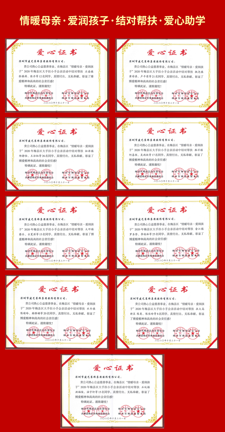 在這場人類歷史上規(guī)??涨啊⒘Χ茸畲?、惠及人口最多的脫貧攻堅戰(zhàn)中,中國建筑裝飾行業(yè)百強企業(yè)第五名——建藝集團積極行動,在貴州畢節(jié)等地參與打造一系列搬遷扶貧項目;梅州政協(xié)常委、建藝集團董事會主席劉海云聯(lián)合深圳市紅荔慈善基金會等機構(gòu),深入廣東河源、梅州、興寧、平遠等地,數(shù)年如一日堅持幫扶、資助、推動貧困地區(qū)摘帽,用廣博的愛詮釋了當(dāng)代民族企業(yè)心系民生、反哺社會的責(zé)任與擔(dān)當(dāng)。