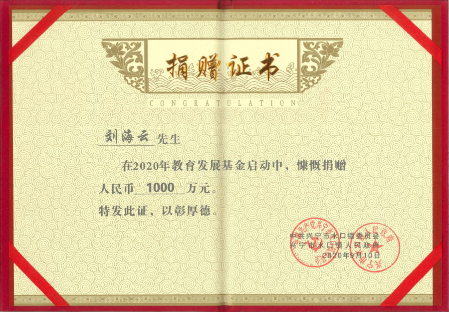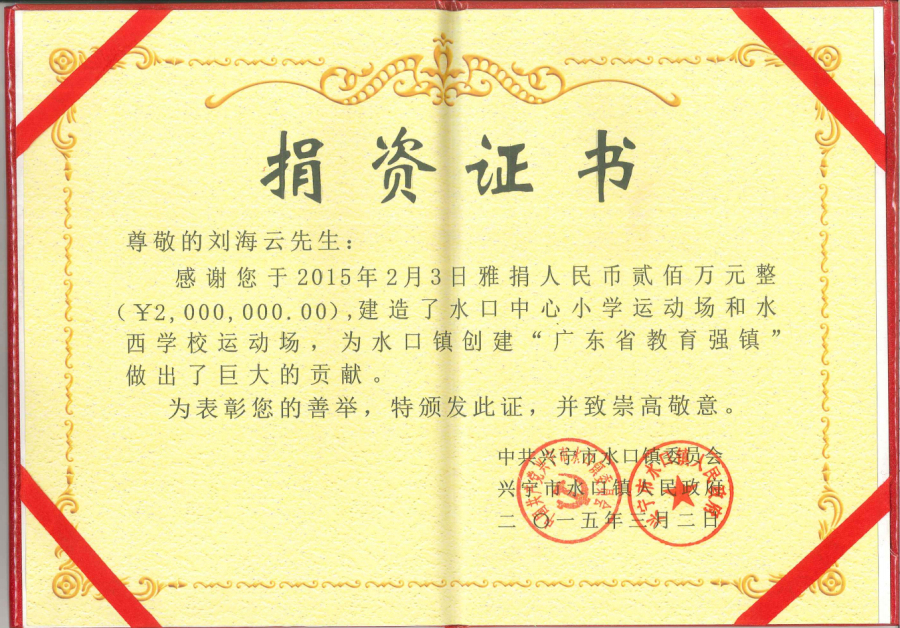 在2019年度“廣東扶貧濟困日”活動中,劉海云向平遠縣仁居鎮(zhèn)捐贈善款100萬元,用于支持當(dāng)?shù)氐缆窐蛄航ㄔO(shè);廣東興寧水口鎮(zhèn)洋新村老人活動中心新農(nóng)村建設(shè)共捐贈900多萬元;廣東平遠縣扶貧助學(xué)捐助270萬元;廣東興寧教育強市捐助200萬元;廣東興寧公益慈善共捐630萬元;廣東平遠縣發(fā)展教育基金會成立暨捐贈儀式上向基金會捐贈800萬元;廣東興寧市水口鎮(zhèn)2020年教育發(fā)展基金啟動中帶頭認捐1000萬元……