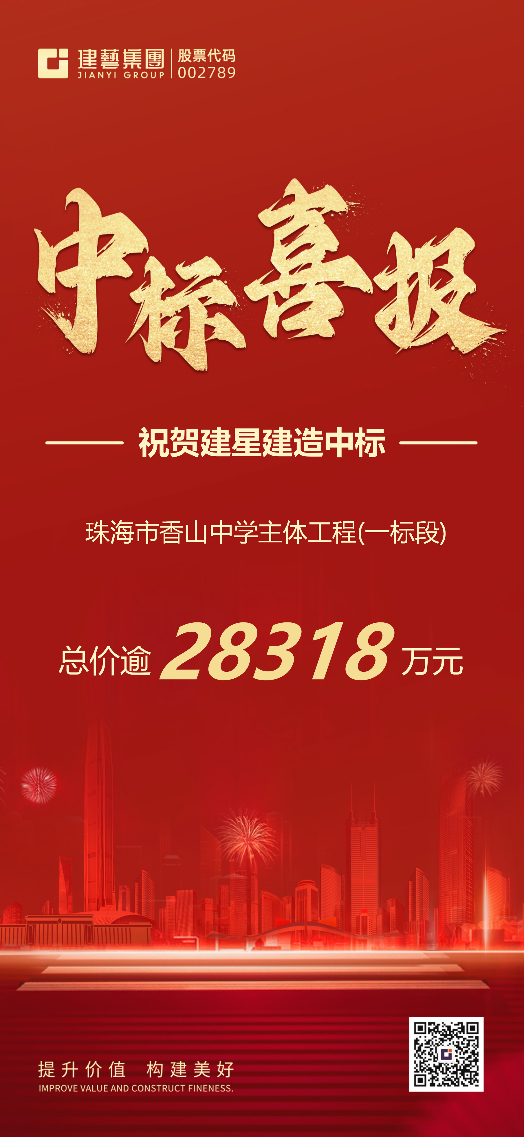 近日,深圳市建藝裝飾集團(tuán)股份有限公司旗下子公司廣東建星建造集團(tuán)有限公司喜獲中標(biāo):珠海市香山中學(xué)主體工程(一標(biāo)段),總價(jià)逾2.83億元。